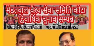 मेड़तवाल समाज कोटा के चुनाव में अध्यक्ष राधेश्याम बोबस एवं महामंत्री...
