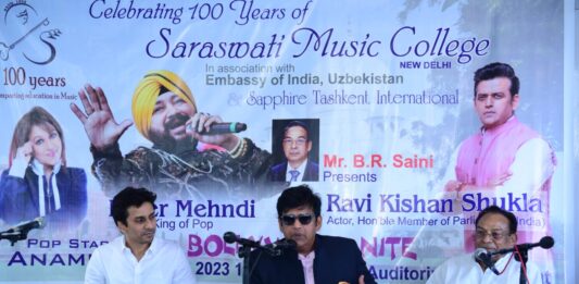 BI News,New Delhi : Saraswati Music College recently Celebrated its hundred years of existence in Delhi , a two decade of its establishment in Tashkent, Uzbekistan. The institute successfully concluded a Cultural cum Excursion Tour to Tashkent from 25th – 29th October, 2023. Cultural extravaganza was celebrated on 27th October .The Institute which was founded … Continue reading “Ravi Kishan, Daler Mehndi, and Anamika Honored with Saraswati Samman in Tashkent”